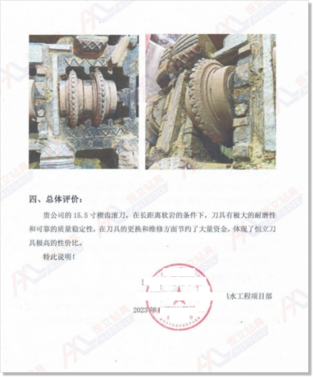在施工方精确测量掘进数据,持续调整优化掘进参数,最大化设备效能,高水平刀具设计方案的条件下,我司的刀具不负客户信任,经长距离软岩掘进,出洞后几乎没有磨损,内外结构皆完好,体现了恒立刀具极大的耐磨性和可靠的质量稳定性优势。客户给与了“大大提升了项目部的掘进效率”,“在刀具的更换和维修方面节约了大量资金,体现了恒立刀具极高的性价比。”的总体评价。