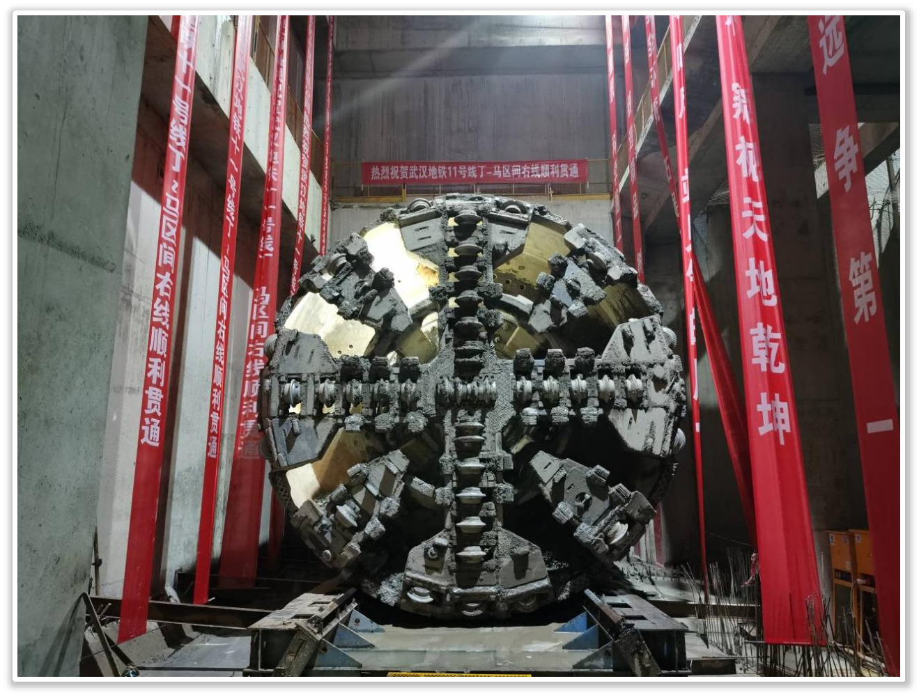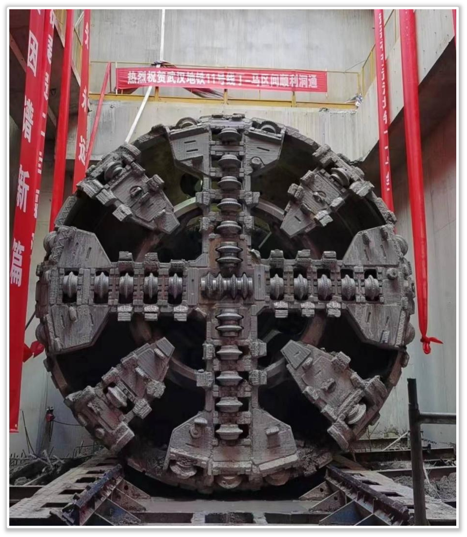 滚刀随着盾构机的旋转破壁而出。标志着武汉地铁11号线东段二期丁字桥站~马房山站区间成功双线洞通!